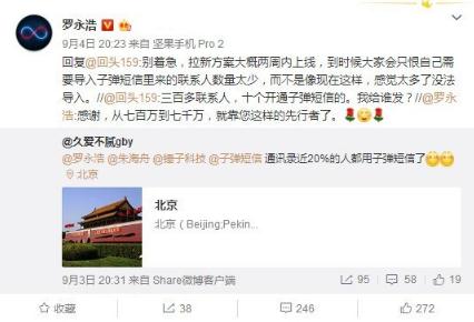 此前,有不少用戶(hù)抱怨身邊的朋友裝了子彈短信的數量太少,對于這一問(wèn)題,羅永浩在近日也進(jìn)行了說(shuō)明,他表示:“拉新方案大概兩周內上線(xiàn),到時(shí)候大家會(huì )只恨自己需要導入子彈短信里來(lái)的聯(lián)系人數量太少,而不是像現在這樣,感覺(jué)太多了沒(méi)法導入。”