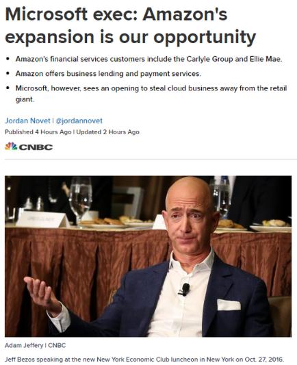 北京時(shí)間 9 月 10 日凌晨,據 CNBC 報道,微軟近期表示亞馬遜進(jìn)軍多種業(yè)務(wù)是給了微軟一個(gè)“竊取”其云服務(wù)市場(chǎng)的大好機會(huì )。原因之一是這些行業(yè)內大多數想要使用云服務(wù)的公司不會(huì )想要使用競爭對手提供的服務(wù)。