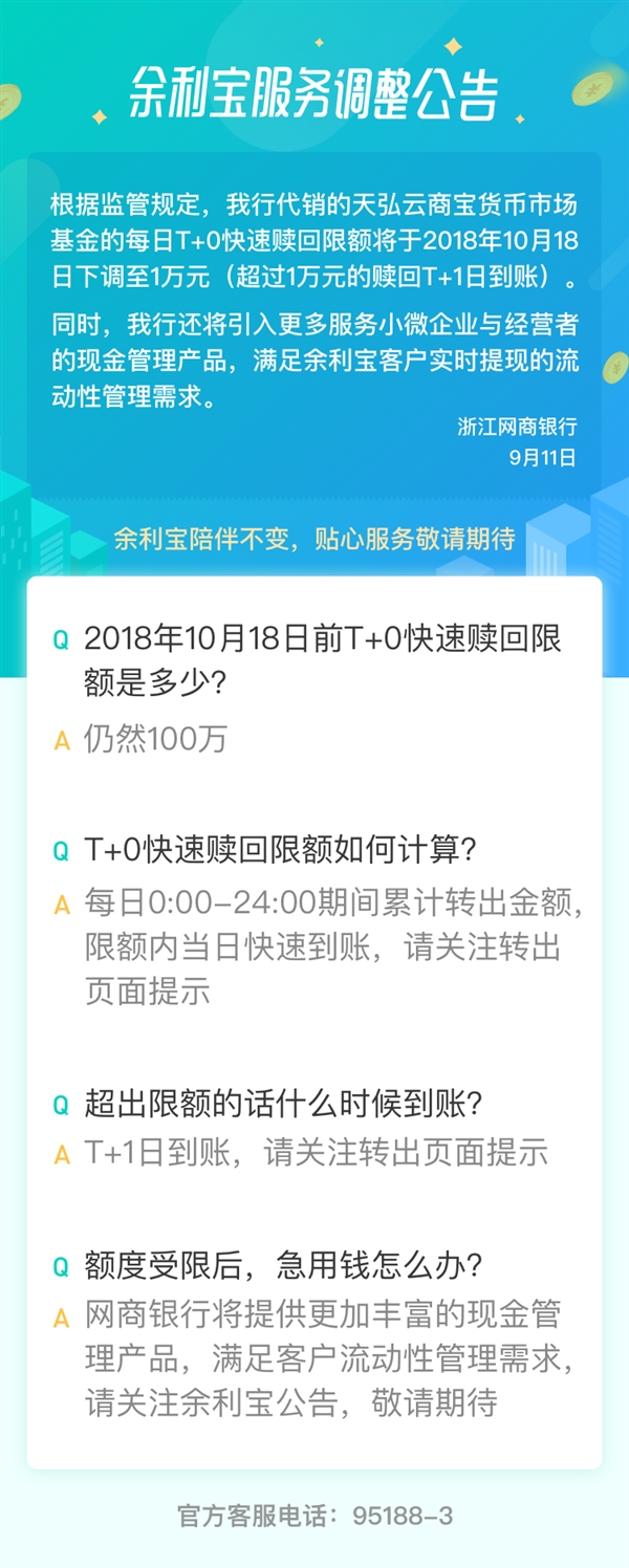今天,支付寶發(fā)布公告,宣布調整余利寶服務(wù),個(gè)人用戶(hù)每日T+0(即交易日當日)快速贖回金額將從 2018 年 10 月 18 日開(kāi)始,從目前的 100 萬(wàn)元下調到 1 萬(wàn)元。屆時(shí),超過(guò) 1 萬(wàn)元的贖回將在T+1 日(即下一個(gè)交易日)到賬。