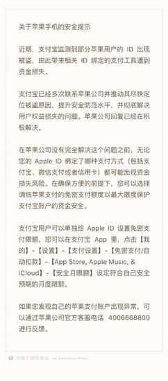10 月 10 日上午消息,支付寶在其官方微博發(fā)布關(guān)于蘋(píng)果手機的安全提示,稱(chēng)監測到部分蘋(píng)果用戶(hù) ID 被盜,由此帶來(lái) ID 綁定支付工具遭到資金損失。