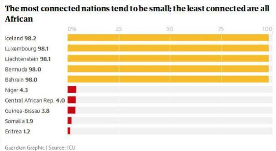 但是很多地方?jīng)]有跟上步伐。在坦桑尼亞、烏干達和蘇丹,大約有 30-40% 的人可以上網(wǎng)。在幾內亞、利比里亞和塞拉利昂,只有7% 到 11% 的人能上網(wǎng)。在厄立特里亞和索馬里,只有不到2% 的人可以聯(lián)網(wǎng)。