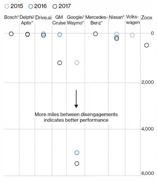 在加州測試自動(dòng)駕駛汽車(chē)的公司需要定期上交測試報告,結果顯示,Waymo 確實(shí)大幅領(lǐng)先各路競爭對手,其自動(dòng)駕駛系統的“脫離”頻率比其他公司要低得多。