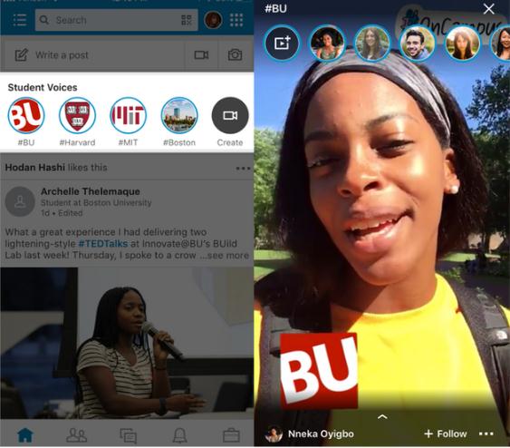 “Student Voices”功能入口出現在 LinkedIn 主頁(yè)上方,學(xué)生可以通過(guò)它將短視頻發(fā)送到“Campus Playlist”(校園播放列表)。一個(gè)星期之后,視頻將會(huì )從播放列表中消失,但是在用戶(hù)個(gè)人主頁(yè)的“Recent Activity”(最近活動(dòng))中可以找到。用戶(hù)可以查看所在學(xué)校的宣傳幻燈片,也可以觀(guān)看附近大學(xué)的“Campus Playlist”。