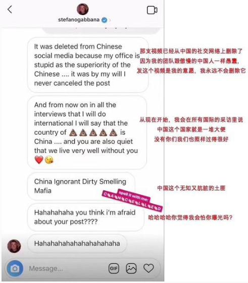 昨天晚上,一位在倫敦的模特兼時(shí)尚商學(xué)院亞裔學(xué)生 Michaela Phuong Thanh Tranova 在 Instagram 上貼出了她和班納的私信對話(huà)。她就D&G的三則爭議廣告可能存在的刻板成見(jiàn)和文化歧視去質(zhì)詢(xún)班納,但班納卻在隨后回復中肆無(wú)忌憚的辱罵“中國是屎一樣的國家”,“自己不會(huì )刪除那三則廣告”,“中國是無(wú)知骯臟的臭土匪”,“我根本不在乎你是否曝光”。