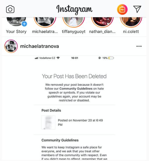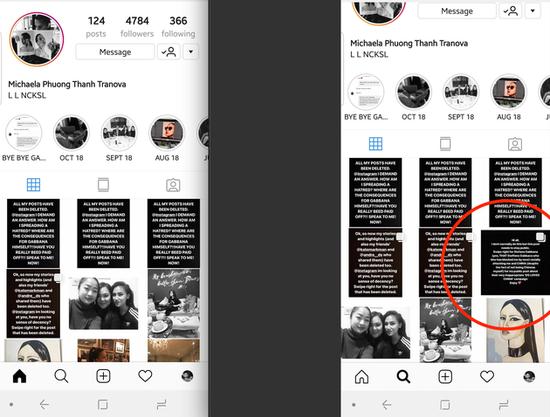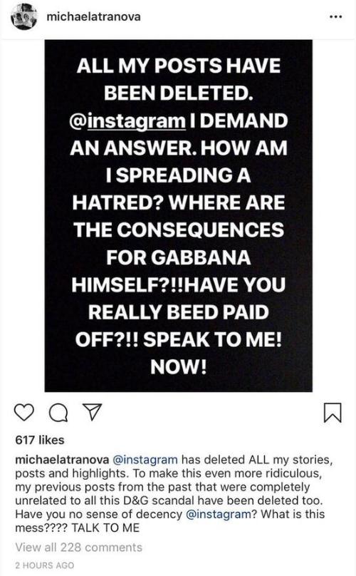 Tranova 對此憤怒地在 Instagram 進(jìn)行抗議投訴,并表示會(huì )再次發(fā)布班納之前的辱華言論截圖。但當她下午再上 Instagram 的時(shí)候,發(fā)現從昨晚到今天自己所發(fā)的所有帖子和 Story 都已經(jīng)被 Instagram 刪除。Tranova 要求 Instagram 給自己作出解釋?zhuān)?ldquo;我怎么就傳播仇恨了?班納本人怎么沒(méi)事?……Instagram 能不能有點(diǎn)體面。”