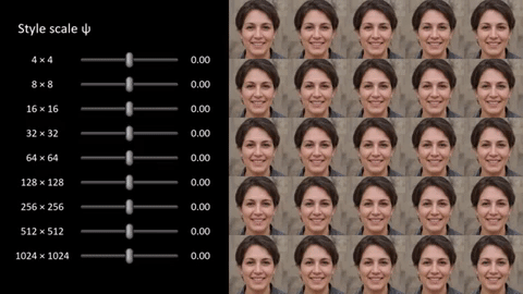 這些風(fēng)格特征或大或小,尺度各異——在非常小的時(shí)候,它可能是面部的單個(gè)特征;在中間的時(shí)候,它可能是鏡頭的構成;在最大尺度上,它就是圖像整體色調之類(lèi)的東西。讓系統對所有這些特征進(jìn)行調整,整張圖像就會(huì )發(fā)生變化;與此同時(shí),僅僅調整一部分可能只會(huì )改變一個(gè)人的發(fā)色,或者是雀斑或面部毛發(fā)的分布。