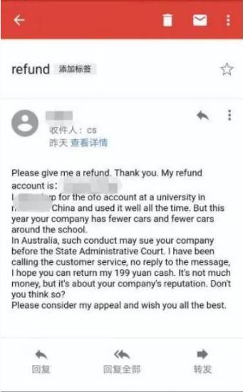 近日,網(wǎng)友@zjt93 發(fā)微博稱(chēng),通過(guò)假裝是一名來(lái)自加州、在中國生活了兩三年、中文不太好、做事喜歡上綱上線(xiàn)的外國人,在給 ofo 寫(xiě)了封投訴郵件后很快收到了退的押金,ofo 還回復了一封英文郵件道歉。