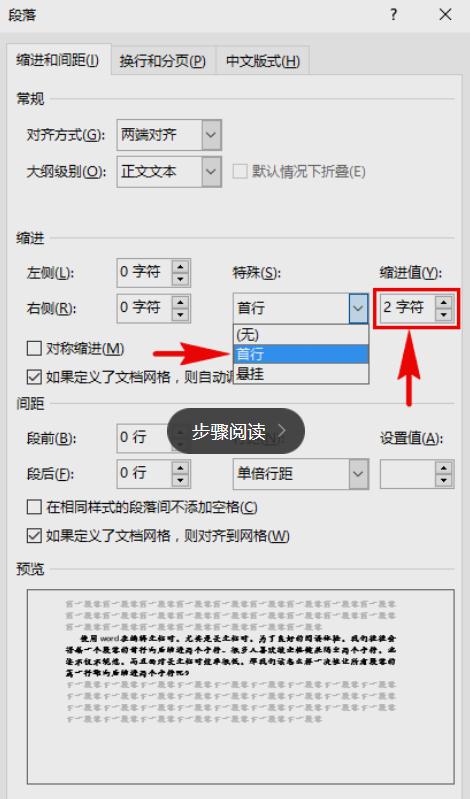 在“縮進(jìn)”欄目組里我們找到“特殊”選項,將特殊設置為“首行”,然后將后面的“縮進(jìn)值”設置為“2字符”。