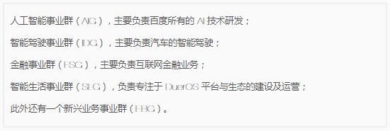 “成為中國乃至世界的 AI 標桿企業(yè)”,是陸奇為百度立下的新使命。百度集團在此次技術(shù)架構調整前,擁有的六大事業(yè)群中,除了主營(yíng)傳統的搜索引擎服務(wù)的搜索公司,其余各部門(mén)都是 AI 戰略的一部分——