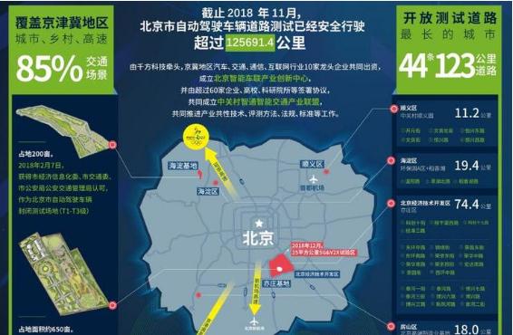 截至 2018 年 11 月,北京自動(dòng)駕駛車(chē)輛道路測試已經(jīng)安全行駛超過(guò) 12.56 萬(wàn)公里,開(kāi)放了 44 條共 123 公里測試道路,覆蓋京津冀地區城市、鄉村、高速等 85% 交通場(chǎng)景。其中位于北京亦莊的測試道路達到 74.4 公里,成為目前國內最長(cháng)的自動(dòng)駕駛測試道路。