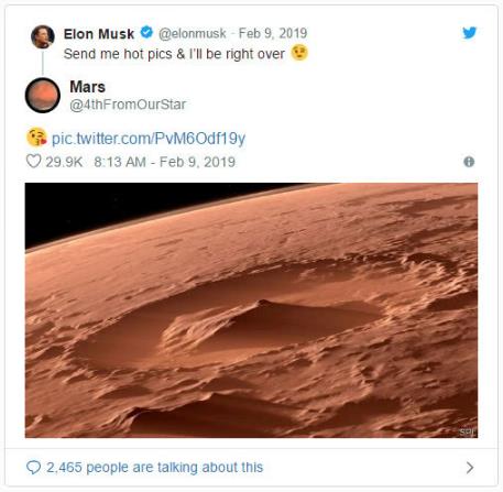 據外媒報道,我們已經(jīng)知道伊隆-馬斯克(ElonMusk)對火星有好感。他和他的太空探索科技公司SpaceX正在積極建造星際飛船(Starship),以便將人類(lèi)帶到這個(gè)紅色星球上。而周五在微博網(wǎng)站Twitter上發(fā)生的怪怪的交流表明,火星也很愛(ài)馬斯克。
