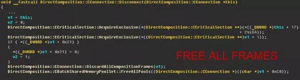 在 CVE-2019-0797 中有易受攻擊代碼獲得了和 DirectComposition::CConnection 結構中幀操作相關(guān)的一個(gè)鎖,而且試圖找到和既定 id 相對應的幀并最終調用釋放 (free) 。這種操作存在的問(wèn)題可見(jiàn)如下圖:
