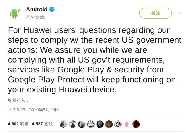 中午 Android 官方正式確認了該消息,Android 推特帳號發(fā)布了一條動(dòng)態(tài)(上圖),正面回應了該事件:回應華為用戶(hù)關(guān)于我們遵守美國政府近期行動(dòng)的問(wèn)題:我們向您保證,在我們遵守美國政府的所有要求的同時(shí),Google Play Protect 的 Google Play 和安全等服務(wù)將繼續在您現有的華為設備上運行。