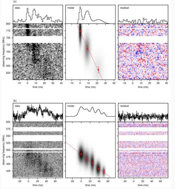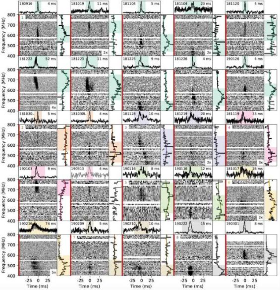 此次,CHIME 望遠鏡不負眾望,在幾個(gè)月的巡天之中探測到 8 個(gè)新的重復 FRB。這 8 個(gè)重復暴與前兩例在很多性質(zhì)上類(lèi)似,特別是在部分脈沖中看到了時(shí)間—頻率漂移現象(見(jiàn)圖3)。