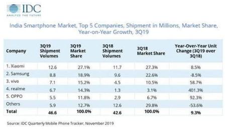 中國小米以27.1%的市場(chǎng)份額繼續保持其第一的位置,緊隨其后的是三星電子,該公司獲得了18.9%的份額,三季度三星在印度銷(xiāo)售了880萬(wàn)部智能手機,銷(xiāo)量下滑了8.5%。小米和三星電子之間的份額差距在擴大。