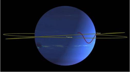 雖然兩顆衛星的軌道相對較近,但它們的不同軌道使彼此相距超過(guò)約 2200 英里。那是因為以更快的速度運行的 Naiad 被鎖定為一種波動(dòng)的運動(dòng),以確保兩顆衛星永遠不會(huì )“偶遇”。無(wú)論兩顆衛星完成其宿主行星軌道的次數多少,其模式都保持不變,Thalassa 在其軌道上平穩運行,隨著(zhù) Naiad 的軌道呈鋸齒形,在其在姊妹衛星的軌道上方或下方運行。
