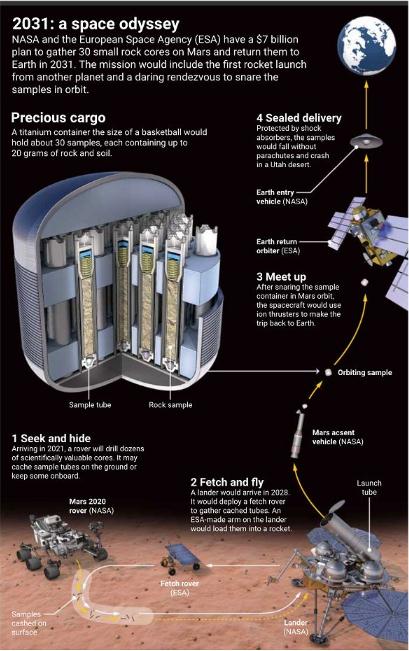 據美國《科學(xué)》雜志網(wǎng)站 11 月 22 日報道,由美國國家航空航天局(NASA)和歐洲航天局(ESA)共同設計的“火星采樣返回”(MSR)任務(wù)現已敲定:耗資 70 億美元,分四步走,從火星上采集約 600 克樣本送回地球。