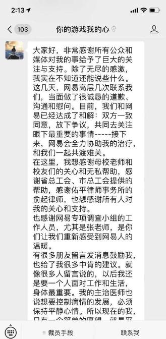 這幾天,網(wǎng)易高層幾次聯(lián)系我們,當面做了很誠懇的道歉、溝通和慰問(wèn)。目前,我們和網(wǎng)易已經(jīng)達成了和解:雙方一致同意,放下?tīng)幾h,共同去關(guān)注眼下最重要的事情-----接下來(lái),網(wǎng)易會(huì )全力協(xié)助我的治療,和我們一起共渡難關(guān)。