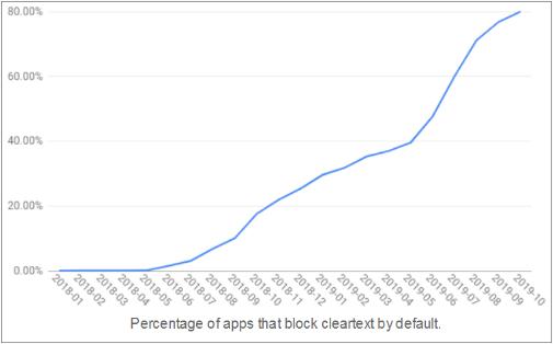 從 2016 年的 Android 7 開(kāi)始,Google 引入了網(wǎng)絡(luò )安全配置文件,該文件允許應用開(kāi)發(fā)人員在執行網(wǎng)絡(luò )通信時(shí)選擇不使用明文。在 2018 年發(fā)布的 Android 9 中,Google 進(jìn)一步采取了措施,使所有以 Android 9 或更高版本為目標的應用程序都將自動(dòng)使用默認策略,以阻止應用程序使用未加密的流量。