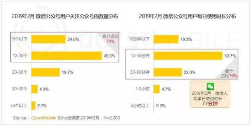 更重要的是,微信推送限制的放開(kāi)已經(jīng)迫在眉睫。因為,微信迫切需要提升當前微信公眾號平臺的活躍度。根據微信官方此前透露的信息,微信公眾號數量已經(jīng)突破 2000 萬(wàn)。另?yè)?QuestMobile 數據顯示,雖然 80% 微信用戶(hù)使用了公眾號,但是 2019 年 2 月,73% 的用戶(hù)關(guān)注的公眾號數量低于 20 個(gè),其中,24% 的用戶(hù)低于 10 個(gè),近 50% 只有 10-20 個(gè)。這意味著(zhù),眾多的公眾號處于一個(gè)無(wú)人問(wèn)津和無(wú)人關(guān)注的狀態(tài)。