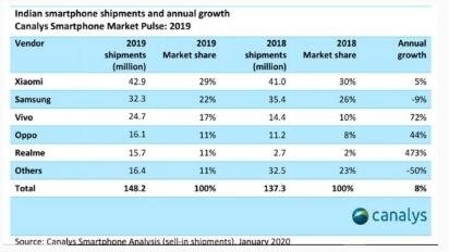 印度2019Q4智能手機市場(chǎng)出貨量3900萬(wàn) 小米排名第一