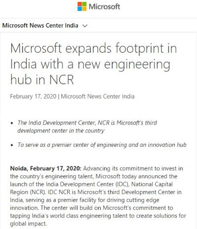 微軟已宣布將在印度建立一個(gè)新的工程中心,以進(jìn)一步兌現為印度工程人才而投資的承諾。作為一項互惠措施,其同樣有助于微軟在當地的業(yè)務(wù)開(kāi)拓與發(fā)展。據悉,該中心位于新德里郊區德里諾伊達(NCR),屬于微軟在印度設立的第三個(gè)開(kāi)發(fā)中心。