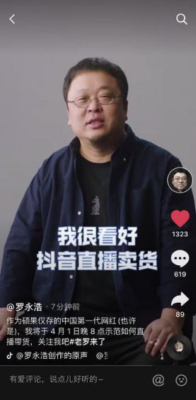 3 月 26 日,羅永浩宣布獨家簽約抖音,在他首支抖音視頻里他表示,“看好抖音直播帶貨”,他希望能夠和粉絲一起努力成為抖音的“帶貨一哥”。