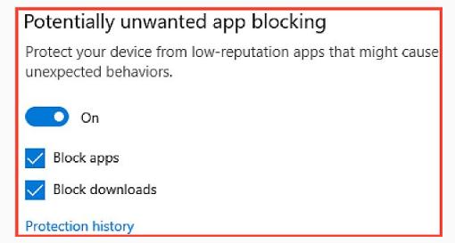 根據微軟的支持頁(yè)面顯示,你可以在 Microsoft Defender 中打開(kāi) PUA 保護,方法是:進(jìn)入 "開(kāi)始">"設置">"更新與安全">"Windows 安全">"應用與瀏覽器控制">"基于聲譽(yù)的保護設置"。激活后,微軟建議在 "潛在不需要的應用攔截 "部分(如上圖所示)下打開(kāi)兩個(gè)額外的設置(攔截應用和攔截下載)。