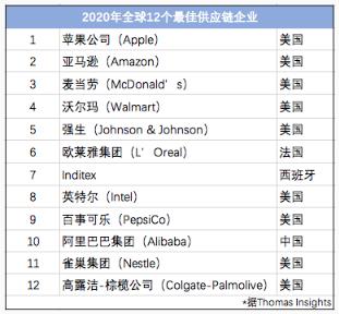 近日,美國老牌制造業(yè)和工業(yè)營(yíng)銷(xiāo)公司 Thomas 評選出 2020 年 12 個(gè)最佳供應鏈企業(yè)。阿里巴巴作為唯一中國公司入選,排名第十。美國企業(yè)占了七席,蘋(píng)果、亞馬遜、麥當勞前三。