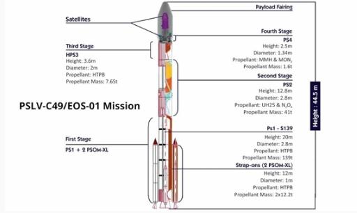 PSLV 火箭為四級火箭,第一級由兩個(gè)捆綁式固體火箭助推器、一個(gè)固體燃料核心級組成,第二級采用偏二甲肼液體燃料,第三級為固體燃料,第四級則是液體燃料。