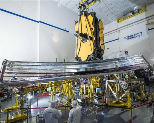 與此同時(shí),為了滿(mǎn)足韋伯望遠鏡的需要,它還配備了同樣龐大、復雜的遮陽(yáng)板——在太空中,有陽(yáng)光照射的地方溫度可達上百度,沒(méi)有陽(yáng)光照射的背面溫度則會(huì )零下上百度,溫差極大。
