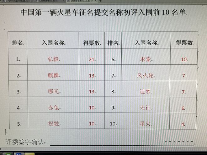 1 月 18 日,國家航天局探月與航天工程中心表示,我國首輛火星車(chē)全球征名活動(dòng)已經(jīng)完成了初次評審。經(jīng)過(guò)評審委員會(huì )的初步評審,遴選出弘毅、麒麟、哪吒、赤兔、祝融、求索、風(fēng)火輪、追夢(mèng)、天行、星火共 10 個(gè)名稱(chēng),作為我國首輛火星車(chē)的命名范圍。計劃從 1 月 20 日 12 時(shí)起至 2 月 28 日 24 時(shí)止,在指定的手機應用程序接受為期 40 天的公眾網(wǎng)絡(luò )投票。