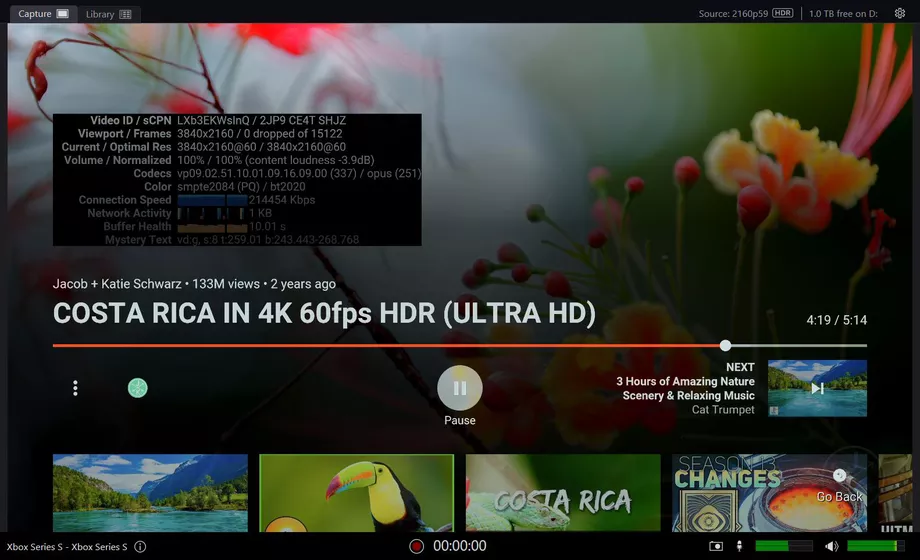 用戶(hù)可以通過(guò)啟用 "stats for nerds "面板(見(jiàn)上圖)來(lái)確認 Xbox 上的 YouTube 應用是否能正確輸出 HDR。很多電視在播放內容時(shí)也會(huì )顯示 HDR 提示或切換到 HDR 模式。