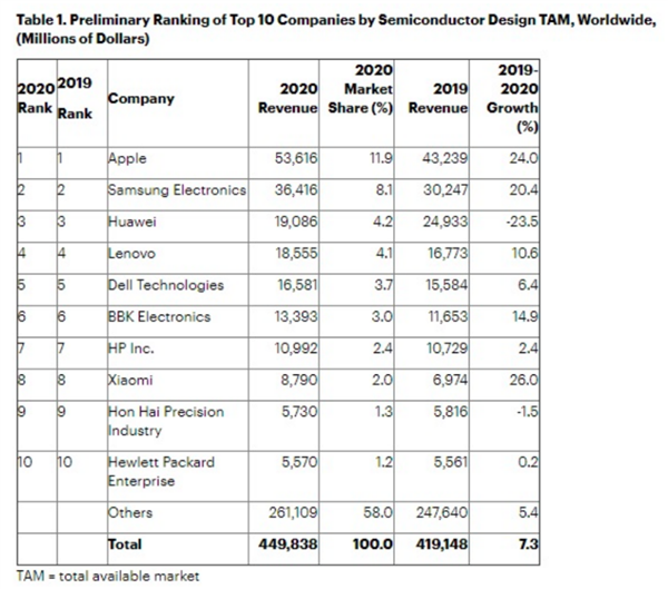 根據Gartner的報告顯示,芯片采購支出排名前三的廠(chǎng)商分別是蘋(píng)果、三星電子、華為。2020年蘋(píng)果的采購金額達到了536億美元,占全部金額的11.9%,同比增幅高達24%。三星緊隨其后,2020年的也支出了364億美元,同比增長(cháng)20.4%。華為排在第三,金額為190億美元,同比減少23.5%。