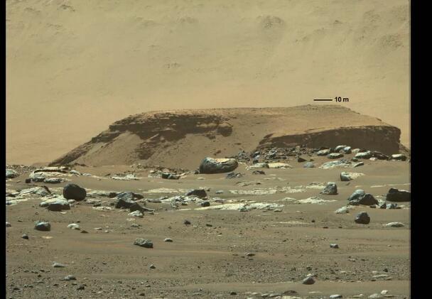 圖3:耶澤洛隕石坑三角洲的景色,遠處的土堆離漫游車(chē)大約有 1600 米遠
