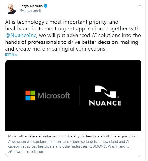 路透社稱(chēng),這顯示出微軟將其領(lǐng)導地位擴大到一個(gè)在疫情期間快速發(fā)展的行業(yè)的雄心。醫療保健提供商已加大對技術(shù)的投資,以提高生產(chǎn)率和數字化醫療服務(wù)。微軟稱(chēng),“這次收購使我們的技術(shù)直接進(jìn)入醫生和病人的循環(huán),這是所有醫療保健服務(wù)的核心。此次收購還將擴大我們在跨行業(yè)企業(yè)人工智能和生物識別安全方面的領(lǐng)導地位。”