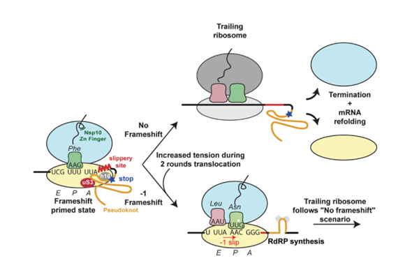 通過(guò)冷凍電鏡建立的三維模型,研究人員觀(guān)察到了一些未曾設想的現象。在合成蛋白質(zhì)的過(guò)程中,核糖體的結構原本是非常靈動(dòng)的。但病毒RNA卻會(huì )形成一個(gè)“打結”一般的結構,卡住入口,產(chǎn)生張力,從而促使“移碼”現象的發(fā)生。