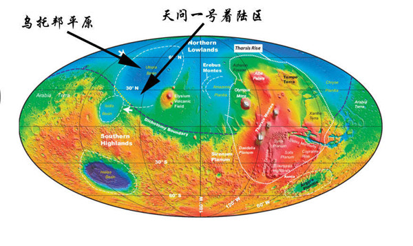 圖注:烏托邦平原在火星上的位置和天問(wèn)一號著(zhù)陸地區。