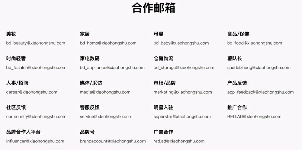 點(diǎn)開(kāi)小紅書(shū)官網(wǎng),最醒目的莫過(guò)于一堆分類(lèi)后的“合作郵箱”。 從“美妝”、“家居”、“母嬰”、“時(shí)尚輕奢”等圍繞女性生活開(kāi)發(fā)的板塊中,可以清晰透露出,小紅書(shū)的核心目標群體為女性。