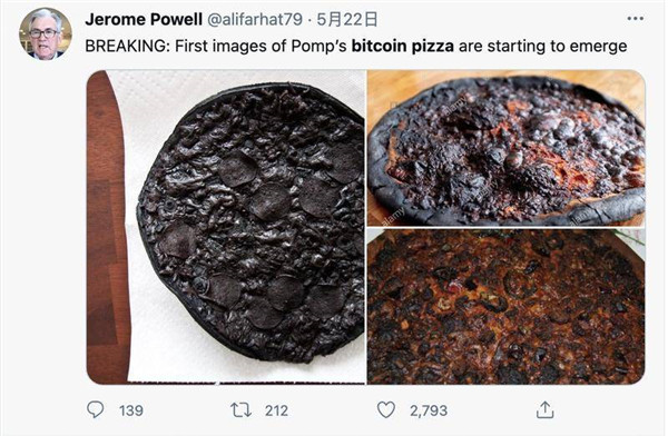 諷刺賬號“鮑威爾”在比特幣披薩節當天的諷刺推文:幣圈大佬Pomp做的比薩長(cháng)這樣