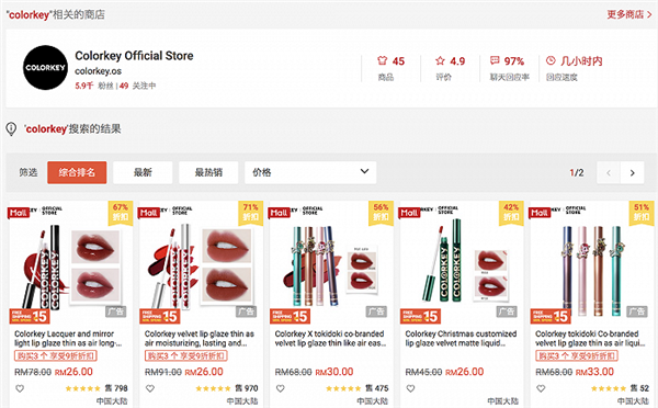 除了官網(wǎng)銷(xiāo)售,品牌們也會(huì )借助其它渠道平臺。目前,包括完美日記、花西子均借助了天貓出海。另一個(gè)彩妝品牌珂拉琪colorkey,則入駐了東南亞最大的電商平臺Shopee。