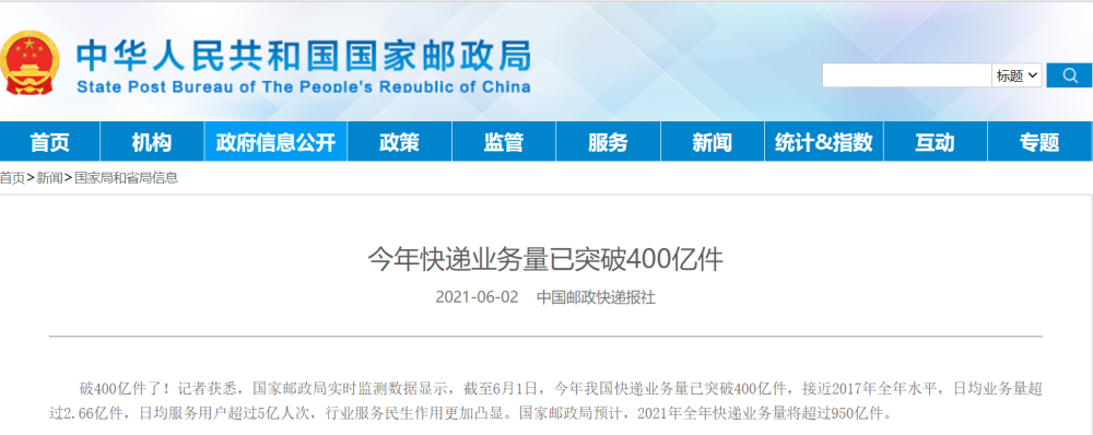 央廣網(wǎng)北京6月2日消息(記者 萬(wàn)玉航)據國家郵政局消息,截至6月1日,今年我國快遞業(yè)務(wù)量已突破400億件,接近2017年全年水平。數據顯示,今年以來(lái)日均快遞業(yè)務(wù)量超過(guò)2.66億件,日均服務(wù)用戶(hù)超過(guò)5億人次,行業(yè)服務(wù)民生作用更加凸顯。國家郵政局預計,2021年全年快遞業(yè)務(wù)量將超過(guò)950億件。