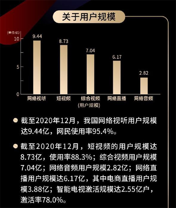而在第九屆中國網(wǎng)絡(luò )視聽(tīng)大會(huì )發(fā)布的《2021中國網(wǎng)絡(luò )視聽(tīng)發(fā)展研究報告》則給出了具體用戶(hù)規模:截至2020年12月,短視頻用戶(hù)規模達8.73億,使用率88.3%。
