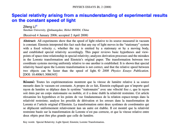 李子豐提供了2008年發(fā)布在物理論文(PHYSICS ESSAYS)期刊上的一篇論文,論文摘要中提到,本文回顧了狹義相對論中時(shí)空關(guān)系的基本假設和觀(guān)點(diǎn);分析了洛倫茲變換和愛(ài)因斯坦原著(zhù)的推導過(guò)程和錯誤。建立了相對運動(dòng)均勻的兩個(gè)坐標系之間的變換。結果表明,基于洛倫茲變換的狹義相對論是不正確的,兩物體之間的相對速度可能比光速快。