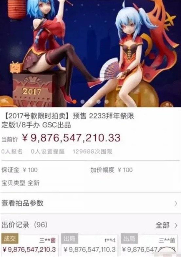 雖然,2017年也曾發(fā)生過(guò)一起震驚全網(wǎng)的“惡意競拍”事件,當年B站進(jìn)行2233娘2017號手辦拍賣(mài)時(shí)價(jià)格一度被人抬到98億7654萬(wàn),不過(guò)那終究是一場(chǎng)普通競拍。