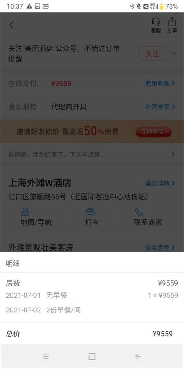 7月1日,帶著(zhù)娃前來(lái)上海旅游的俞先生(化名)在美團平臺預訂了一間當晚入住上海外灘W酒店一晚的客房,房型顯示為46平方米的外灘景觀(guān)壯美客房,價(jià)格9559元(人民幣,下同)一晚。