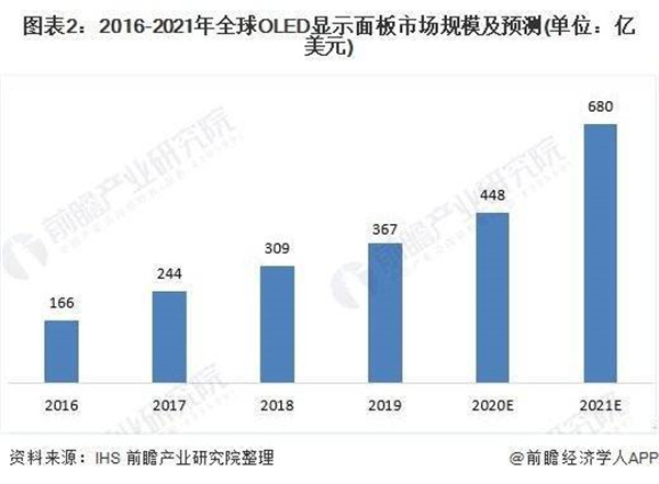 根據 IHS 發(fā)布的數據,2019 年 OLED 面板全球出貨量達 7.34 億片,比 2018 年上升了近 20%,預測2021 年 OLED 顯示面板市場(chǎng)規模收益達到 680 億美元。