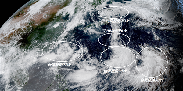 這涌動(dòng)的熱帶云團其實(shí)正是季風(fēng)活躍拉動(dòng)起來(lái)的強盛季風(fēng)槽,在這道季風(fēng)槽中,臺風(fēng)胚胎正在大量涌現。衛星云圖上可見(jiàn),今天下午西太平洋一共有5個(gè)臺風(fēng)胚胎正在活動(dòng),一個(gè)是位于日本以東洋面的臺風(fēng)胚胎95W,一個(gè)是位于硫磺島附近的臺風(fēng)胚胎96W,一個(gè)是我國臺灣附近的臺風(fēng)胚胎97W,一個(gè)是位于美國關(guān)島西北方的臺風(fēng)胚胎99W以及位于美國東北方的臺風(fēng)胚胎98W。