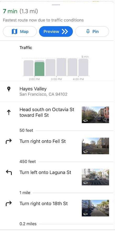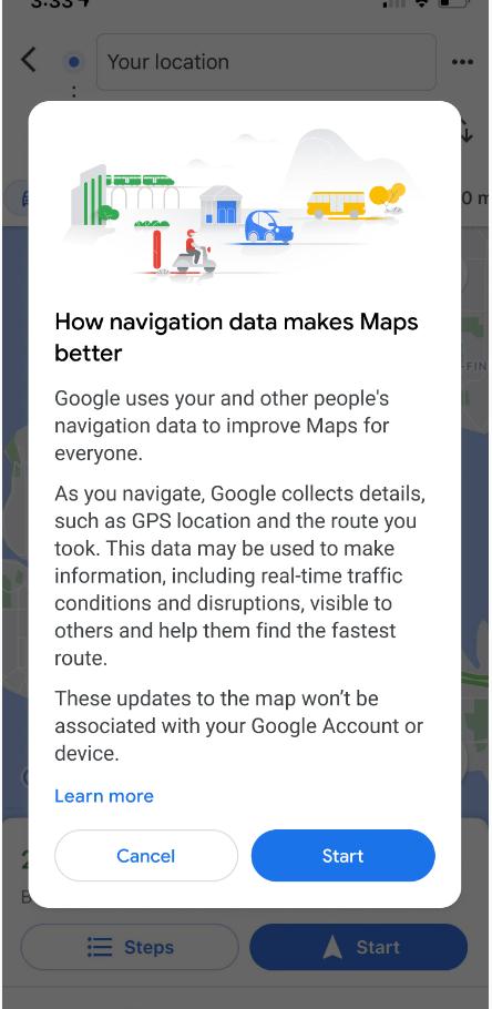但值得注意的是,如果你不同意按"開(kāi)始"鍵,導航功能將被限制在極其簡(jiǎn)陋的靜態(tài)的方向列表中,只在轉彎的每一步提供街景提示,這相當于倒退 20 年使用 2001 年的地圖應用程序。