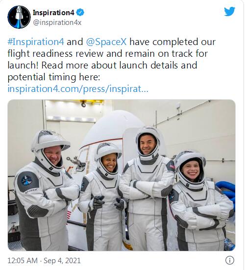 9 月 4 日,SpaceX 首個(gè)純民用任務(wù) Inspiration4(靈感 4 號)指揮團隊宣布,任務(wù)整體規劃已通過(guò)了相關(guān)部門(mén)的審查,計劃在未來(lái)數周內執行升空。